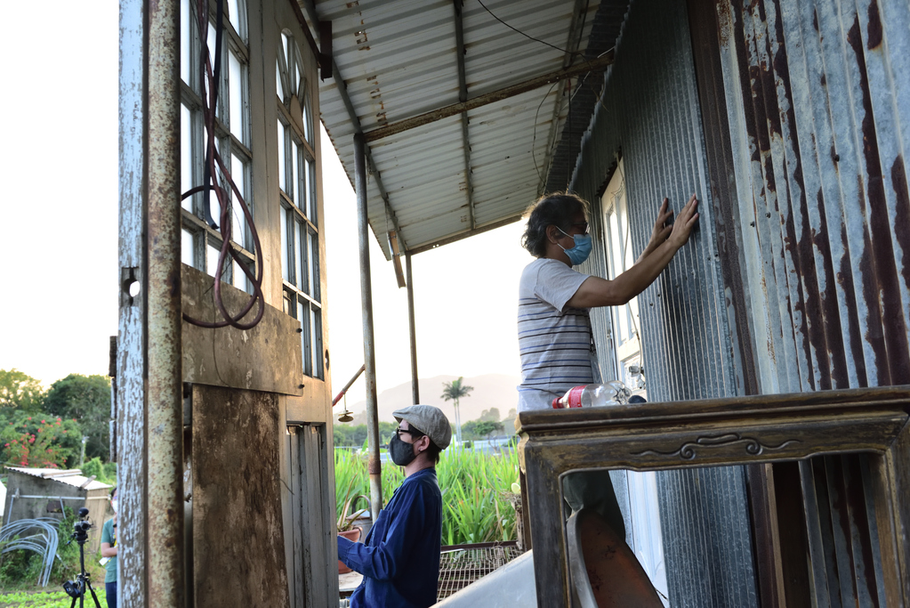 2024 年元朗「四圍跳」的結業演出,在歐羅有機農場內其中一段演出他與 Jonathan 合奏,而整間鐵皮小屋就是他的「樂器」!另一段由年輕舞者 Carmen Yu 編作的作品,她全身包牢的她就像泥地上一株生機勃勃的植物,在田野間舞蹈,而背景「音樂」則是 Edmund 用農場環境四周隨處可拾的物品如石頭、木板、鐵管及磚塊等東西碰撞發聲來進行配樂。