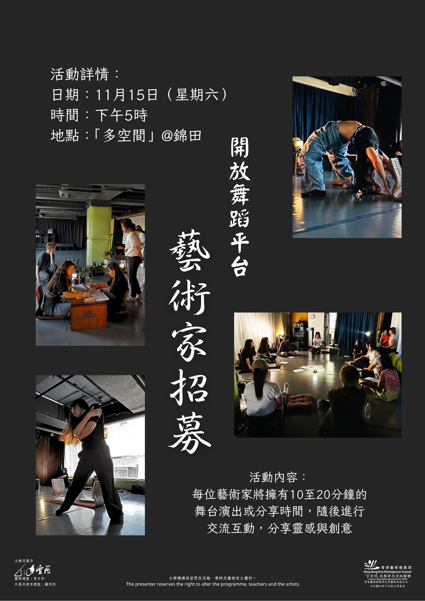 「多空間」誠邀所有舞者、編舞、劇埸創作人、形體及表演藝術家,加入我們的「開放舞蹈平台」!無論你是經驗豐富的藝術家還是初出茅廬的創作者,只要你充滿熱情,我們都期待你的參與!